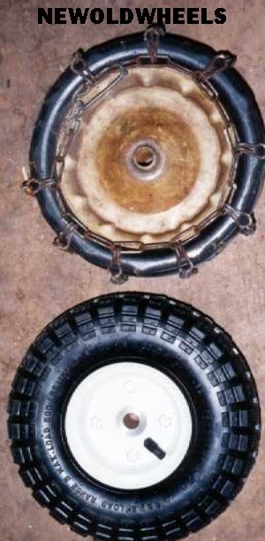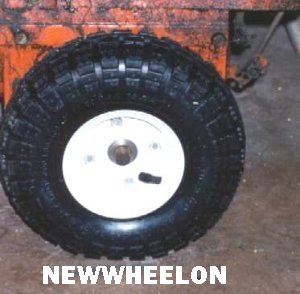 The first picture (newoldwheels.jpg) is of the old wheel side by side with the new as bought wheel. They were made in China (like everything else is!) price for 4" wheel tire tube and two bearings is $4.50 each!!