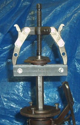Install the puller so it mates up with the hex shaft, center it and tighten the nuts just finger tight. Install a common small gear puller and remove the end plate and bearing with the puller. Be sure to touch up the shaft so it's a clean fit for next time.